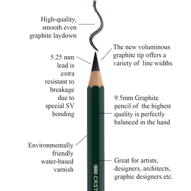 Faber-Castell offers studio-quality graphite sketch pencils for art students and aspiring artists. These pencils are made with finely ground graphite and clay giving the artist a smooth, consistent marks. Graphite pencils are available in 8 degrees of lead hardness including 4H, 2H, H, HB, B, 2B, 4B, 6B.