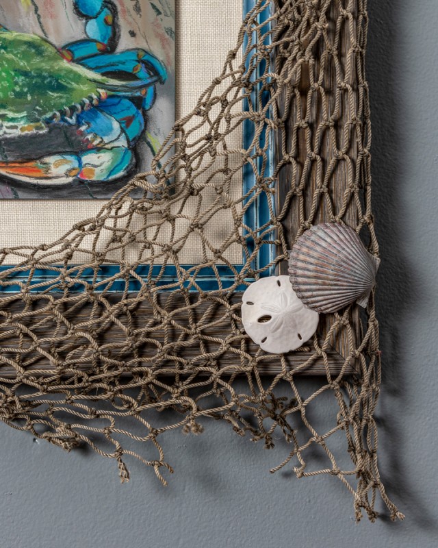 This pastel painting of a crab in a picture frame is certainly unique! This little guy just needed something creative to complement his uniqueness. A rustic wood frame was chosen, accented with a rustic blue filet that compliments the blue of the crab. Then a textured linen mat board was used to further push the texture. And, to cap it all of a net and shells!